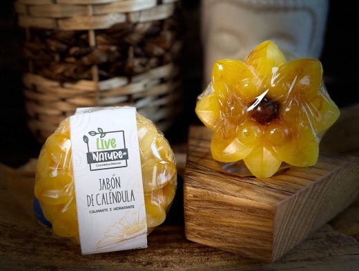 Jabón elaborado con glicerina vegetal y aceite vegetal de calendula, aceite esencial de lavanda, romero, vitamina E, manteca de karité para tratamientos de ezcemas de la piel, calma, desinflama e hidrata la piel. Antioxidante, cicatrizante, antiage, regenera los daños causados por los rayos ultravioleta.
